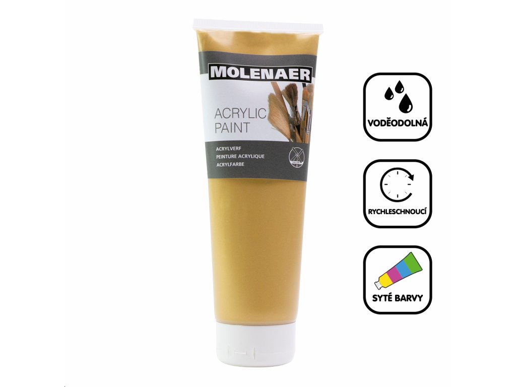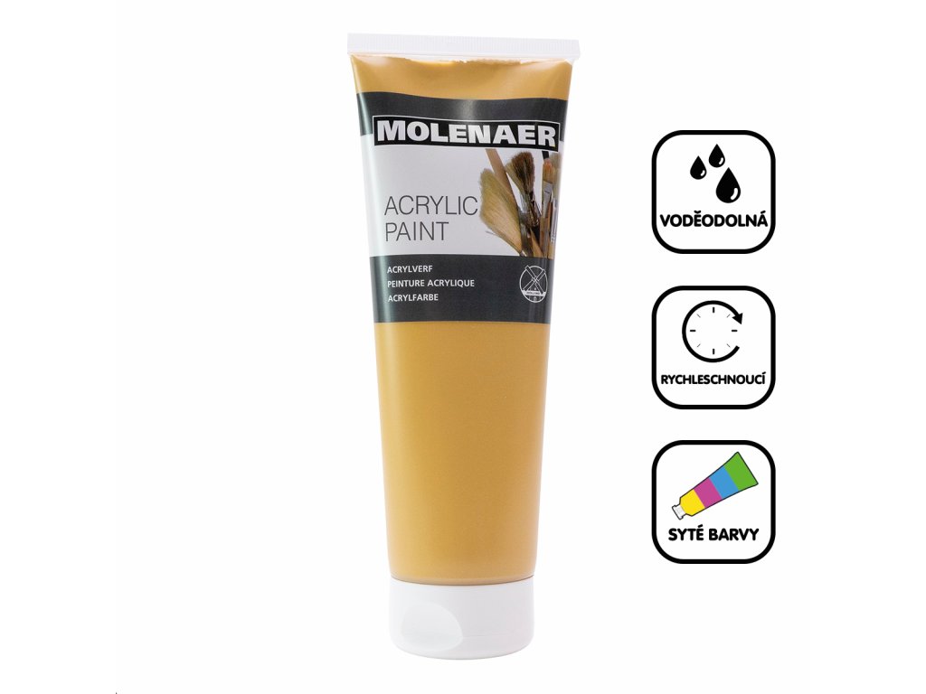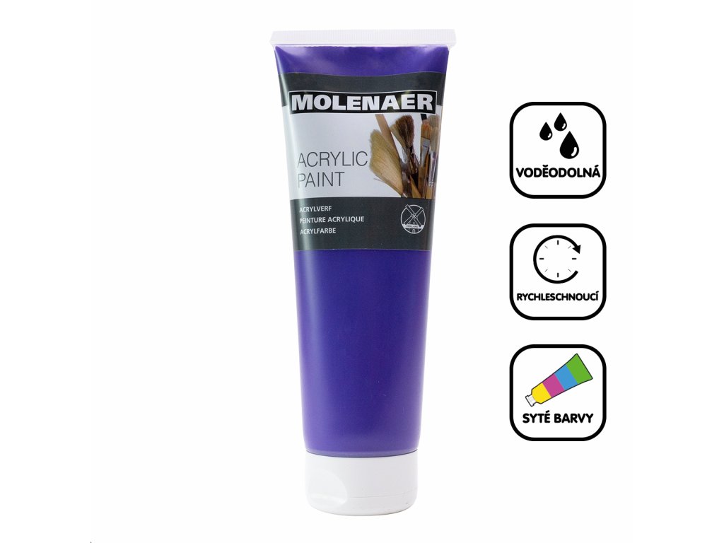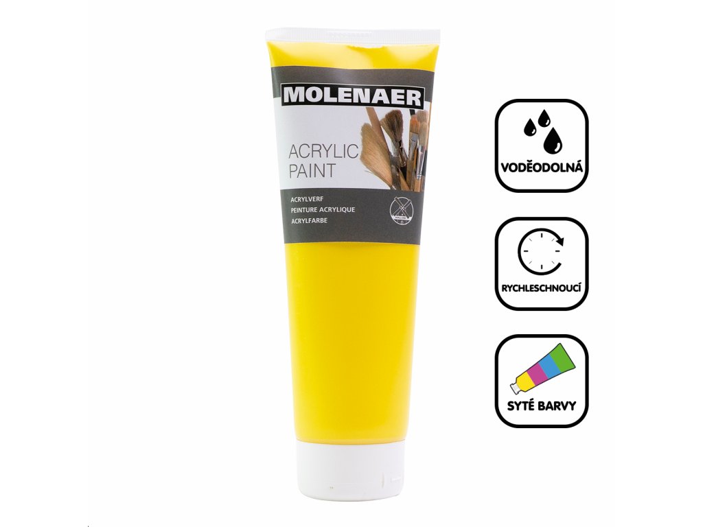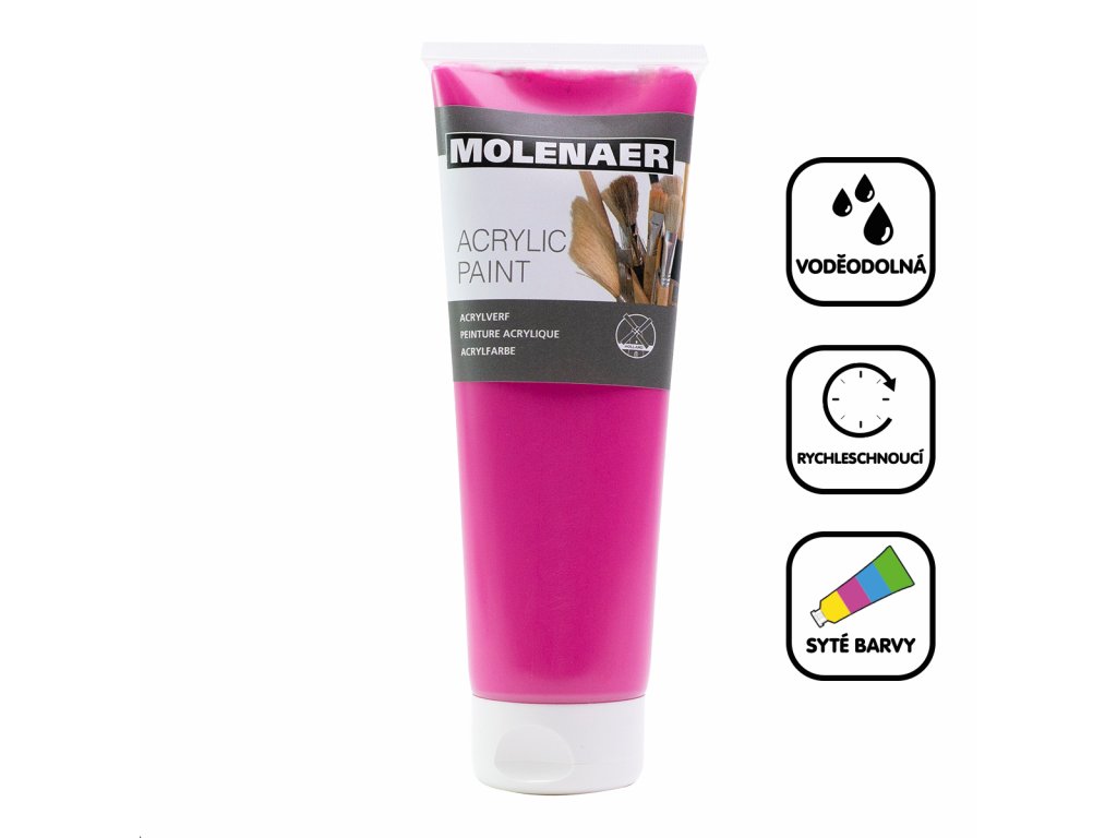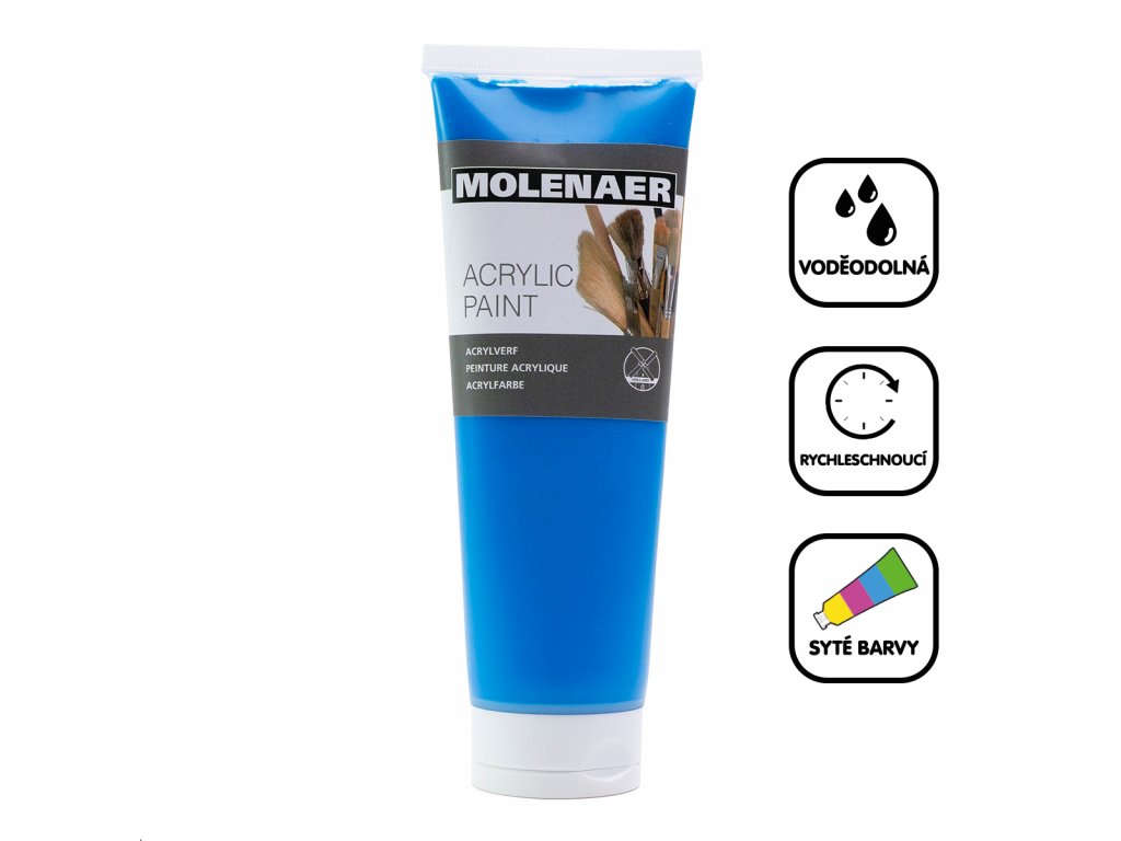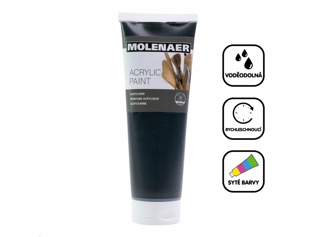 Akrylové barvy Molenaer jsou vhodné pro začátečníky i zkušené profesionály. Lze je používat na různé materiály, od papíru přes plátno až po dřevo a kámen. Jsou vodou ředitelné a po zaschnutí naopak voděodolné. Rychleschnoucí syté barvy s vysokým obsahem pigmentu jsou vhodné pro jakékoliv výtvarné techniky.