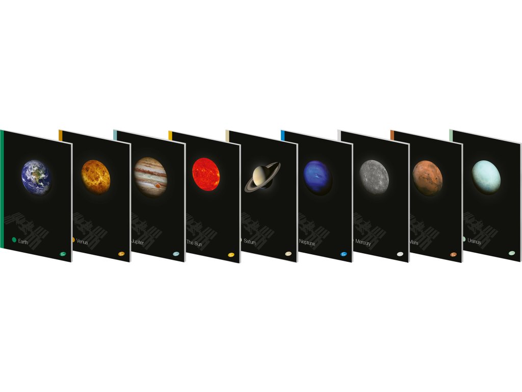 Kolekce sešitů s fotografiemi planet Sluneční soustavy potěší malého i velkého astronauta. Zadní strana obálky obsahuje krátký popis vztahující se ke konkrétní planetě.