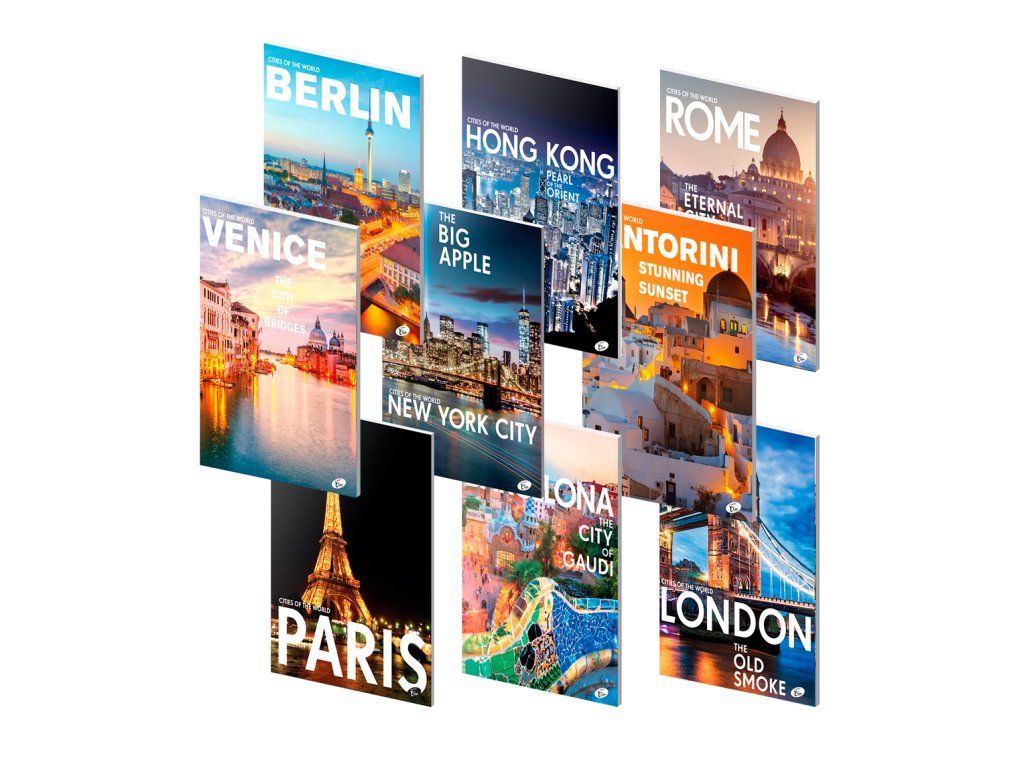 Kolekce fotografií světově známých metropolí. Design obálky doplňuje efekt lesklých detailů.