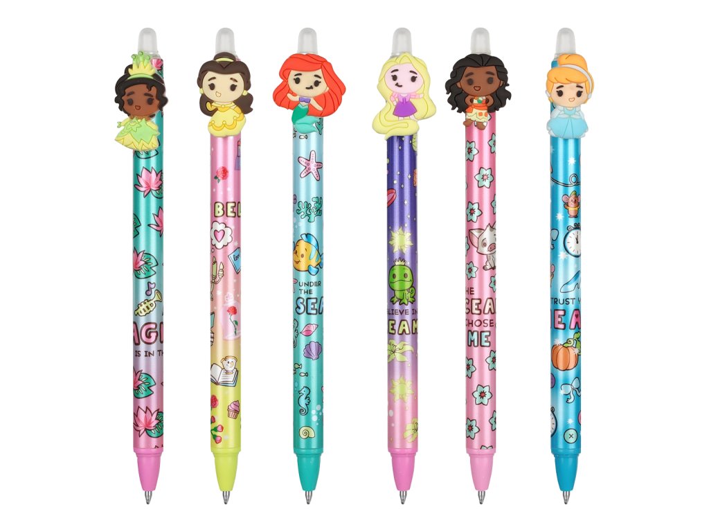 Praktická gumovatelná pera pro děti s měkkou koncovkou a motivy nejznámějších princezen z dílny Walt Disney. Kvalitní inkoust lze v případě potřeby jednoduše vygumovat a přepsat.