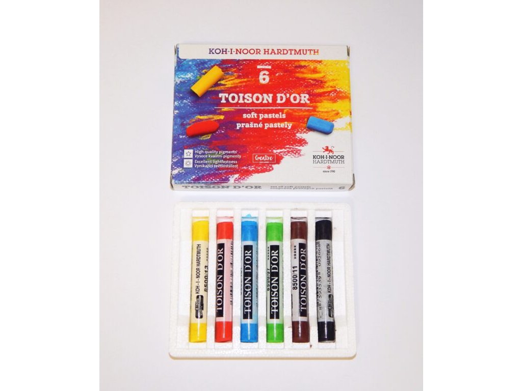Souprava 6 ks kulatých prašných pastelů s ovinem o průměru 10 mm a délce 75 mm. Mají vynikající psací vlastnosti i světlostálost. Při kreslení je možné použít držák pastelů KOH-I-NOOR Versatil. Kresbu doporučujeme po dokončení stabilizovat fixativem.