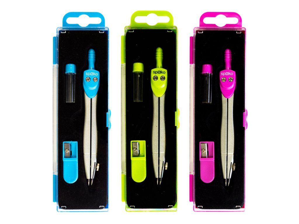 Jednoduché kovové kružítko v atraktivních barvách, vhodné do školního penálu. Výhodné obsah balení s náhradními tuhami a ořezávátkem v praktické pevné krabičce. Ideální pro první stupeň základní školy. Manipulace s tuhou pomocí šroubu. Tvarovaný úchop s drážkami pro pohodlné držení.