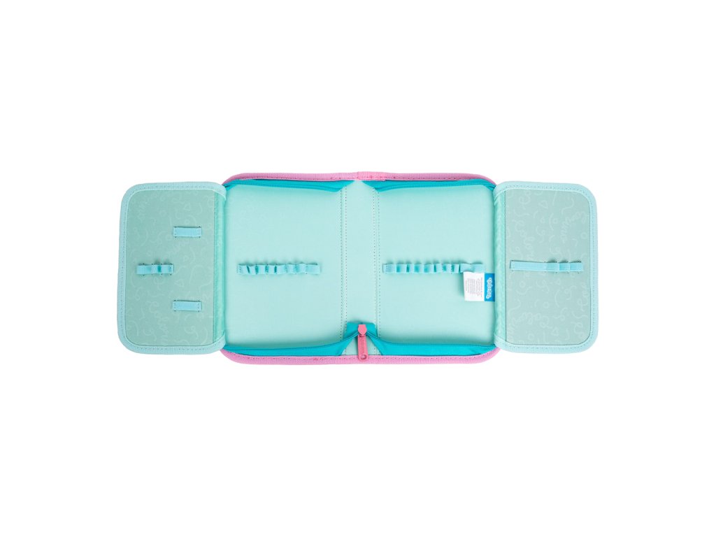 Rozkládací penál s přihrádkami na psací výbavu a jiné doplňky. Dvě postranní chlopně jsou opatřeny transparentní kapsou, chránící obsah penálu. Odolný kovový zip je sladěný s kontrastním s lemováním. Vybavení není součástí penálu.