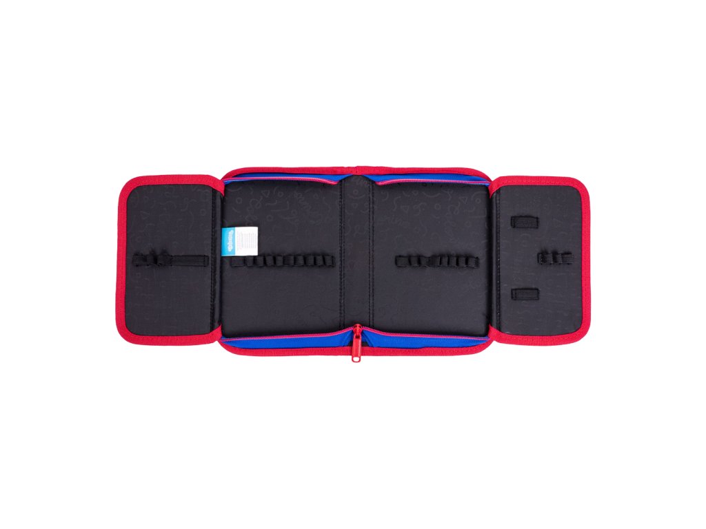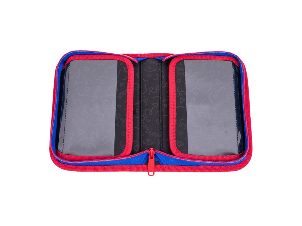 Rozkládací penál s přihrádkami na psací výbavu a jiné doplňky. Dvě postranní chlopně jsou opatřeny transparentní kapsou, chránící obsah penálu. Odolný kovový zip je sladěný s kontrastním s lemováním. Vybavení není součástí penálu.