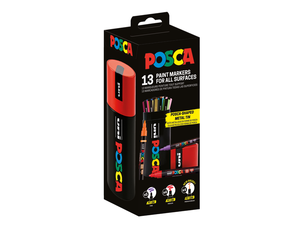 Stylová sada 13 popisovačů, která se hodí jako originální dárek pro každého, kdo miluje kreslení a nekonečné možnosti tvoření. Kombinuj barvy podle vlastní fantazie a vytvářej jedinečné barevné variace. Sada obsahuje 3 typy hrotů (5× PC-3M, 4× PC-5M, 4× PC-5BR), které jsou ideální pro jemné detaily, výrazné tahy nebo vybarvování. Praktická plechová dóza ve tvaru Posca popisovače dodává celé sadě atraktivní vzhled a zároveň je uchová bezpečně pohromadě.