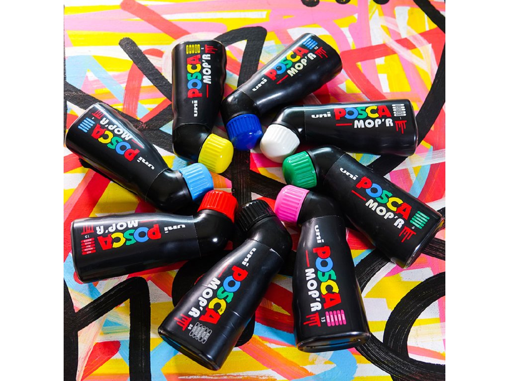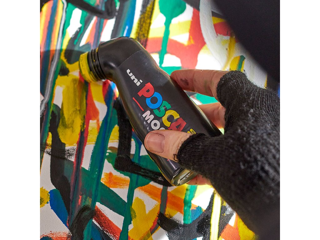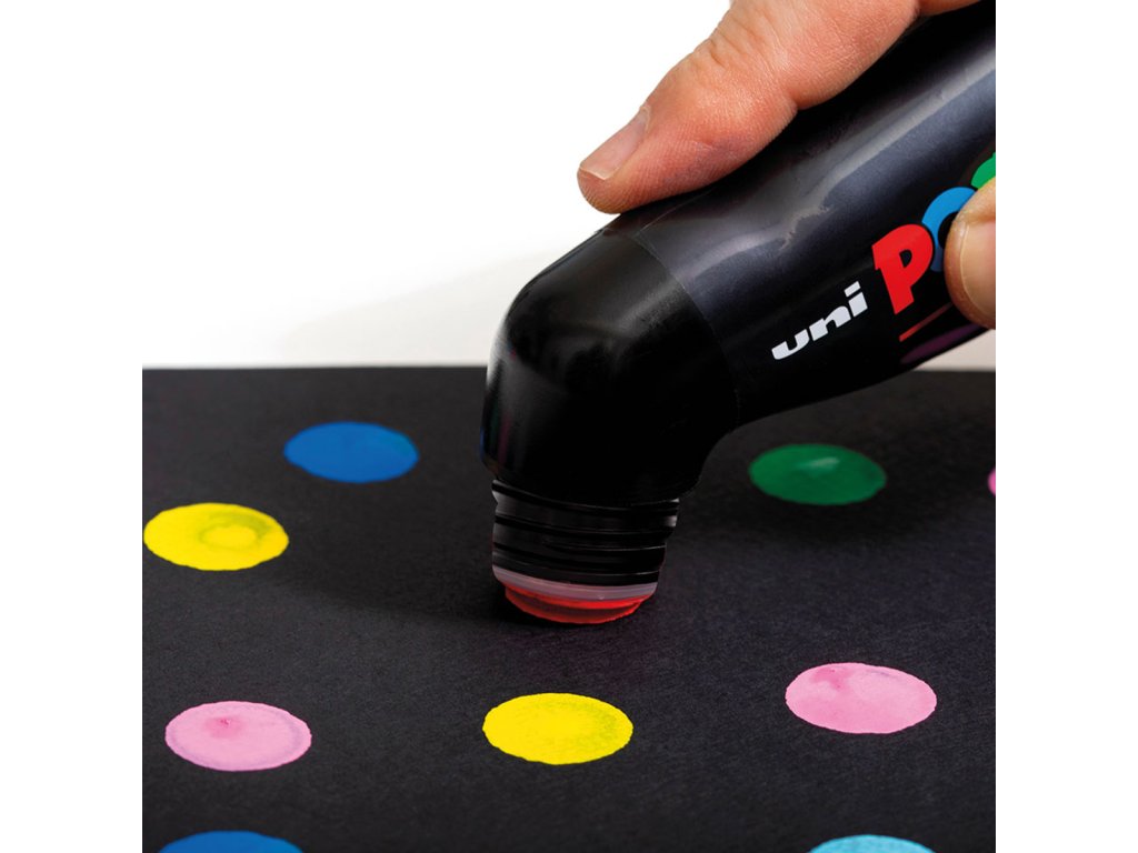 Jedinečný. XXL kulatý a pěnový hrot je mimořádně přesný. Zábavný. Můžete ho držet jako běžný popisovač nebo vzhůru nohama. Ideální pro kontrolovaný „drip“ efekt. Městský. Bubble lettering, kontrolované stékání, stříkance, sprejové efekty. Jasný odkaz na historii značky POSCA – street art. Návykový. Velké plochy, nekonečné linie, instinktivní použití, nekonečná zábava.