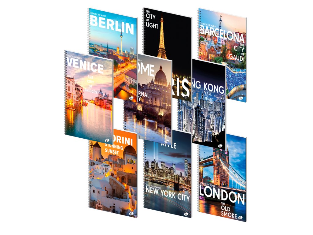 Kolekce fotografií světově známých metropolí. Design obálky doplňuje efekt lesklých detailů. K dispozici v devíti motivech.