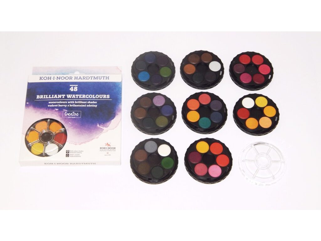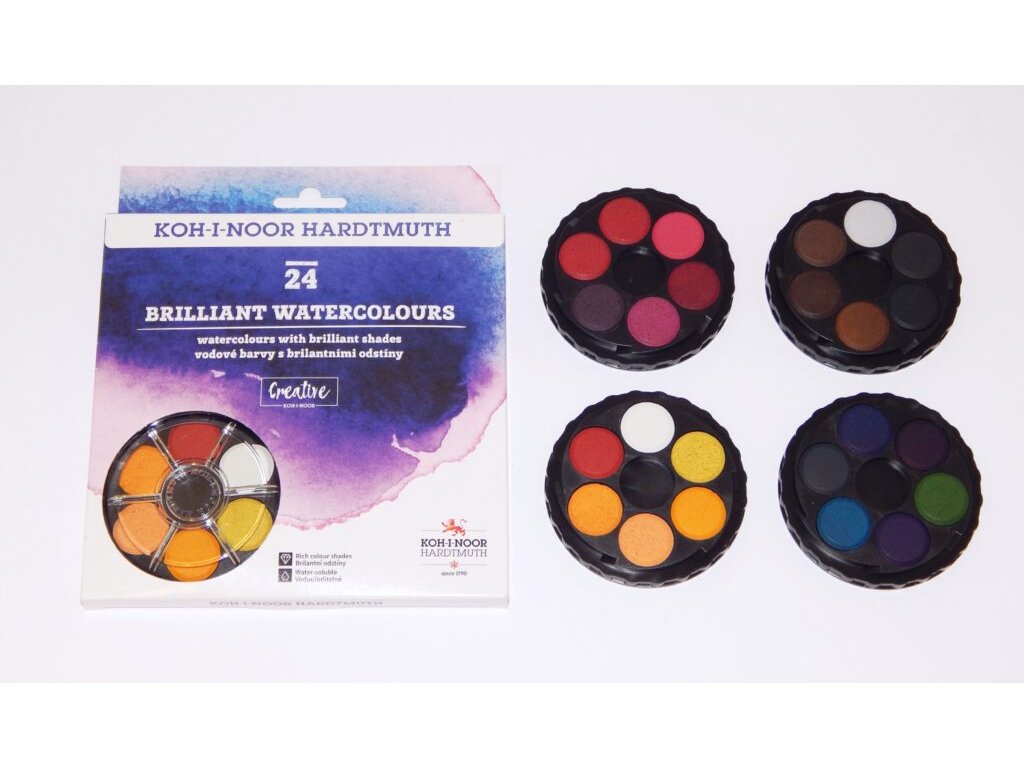 Vodové barvy o průměru tablet 22,5 mm s 24 brilantními odstíny vhodné pro speciální výtvarné techniky, např. pro kolorování fotografií, malby portrétů, malby na dekorační předměty, zdobení kraslic aj. Vložené v plastovém barevníku s transparentním víčkem.